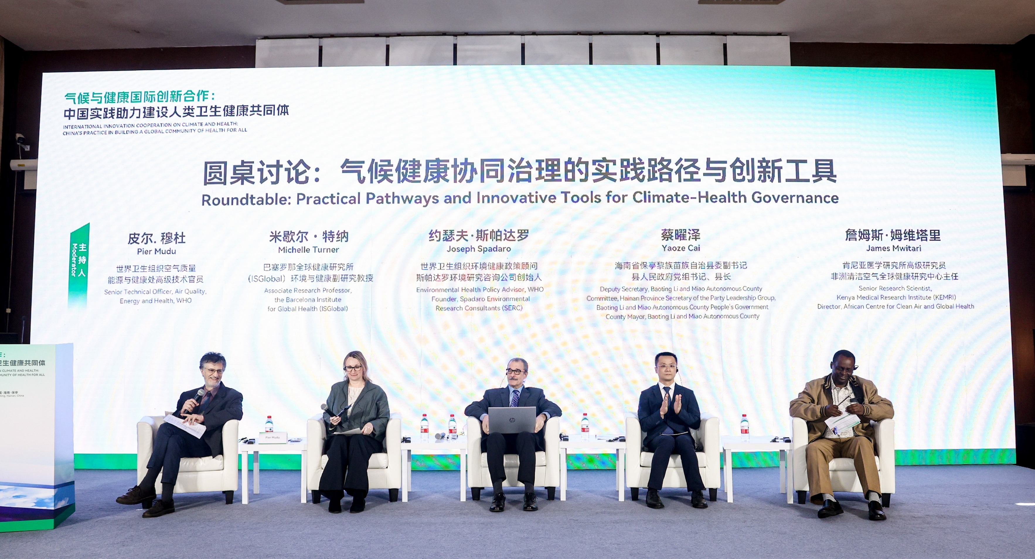 WHO空气质量、能源与健康处高级技术官员皮尔·穆杜主持圆桌讨论。保亭黎族苗族自治县县长蔡曜泽与巴塞罗那全球健康研究所教授米歇尔·特纳、WHO环境健康政策顾问约瑟夫·斯帕达罗、肯尼亚医学研究所高级研究员詹姆斯·姆维塔里等嘉宾,聚焦保亭作为全球气候健康“现实实验室”“技术验证场”“国际对话窗”的发展愿景,围绕开源工具、气候韧性-健康经济协同效益分析、社区主导的行动框架展开对话,为保亭提供了“导航图”“明白账”“普惠路”。